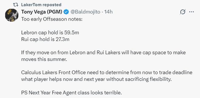 湖媒Tony Vega写道:2026年夏詹姆斯可以释放5950万的空间,八村垒则可以释放2730万的空间,如果湖人不再留用詹姆斯、八村,那么湖人在2026年夏就有足够的薪金空间来运作。