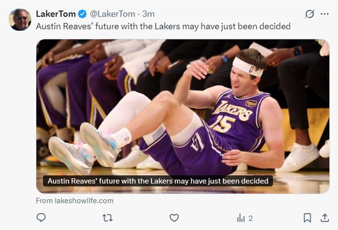 随着湖人核心之一的奥斯汀-里夫斯遭遇伤病,这支湖人本赛季的前途又变得黯淡起来,根据Shams的说法,里夫斯遭遇左腿腓肠肌二级拉伤,至少需要四周的康复时间,一般来说是4-6周。(湖人目前遭遇三连败已经跌至西部第五)