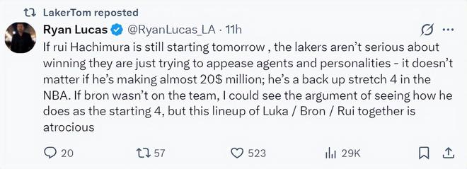北京时间12月28日,湖人记者瑞安-卢卡斯明确表示,如果湖人还是用八村垒打先发那么他们就不是真的想赢下比赛,他们只是在试图安抚经纪人与一些球员,八村垒虽然接近2000万的年薪但他的实力只能是NBA替补,如果詹姆斯不在队内湖人不可能给他先发,他搭档詹姆斯、东契奇的先发太糟糕了。