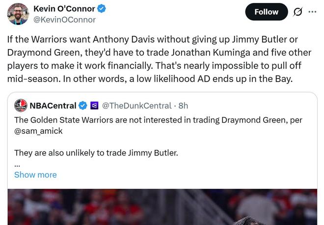 名记Kevin O'Connor表示勇士队很难得到浓眉哥,因为他们不想送出巴特勒或者追梦,那么想要围绕库明加追求浓眉哥,勇士队需要搭上至少另外5名球员才能配平薪资,这在赛季中期几乎是不可能完成的操作。