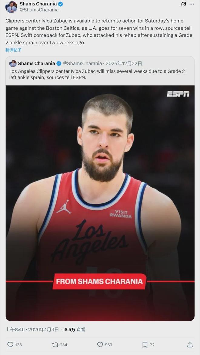 北京时间1月3日上午8点46分,NBA名记Shams Charania报道,快船中锋伊维察-祖巴茨将在明天对阵波士顿凯尔特人的比赛中复出,帮助快船冲击七连胜。祖巴茨在12月21日对阵湖人时遭遇脚踝二级扭伤,到明天的话也就是休战2周。