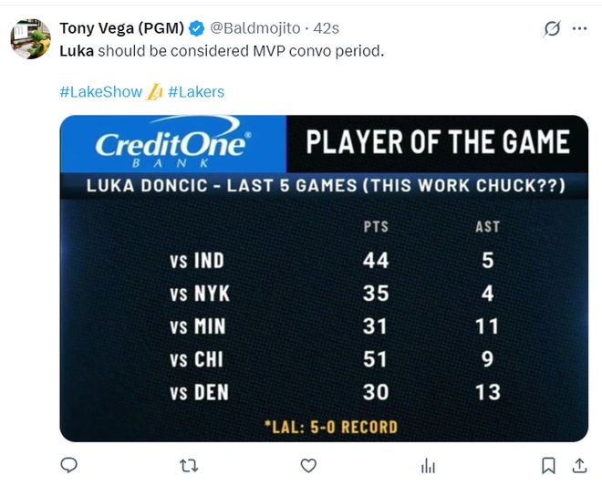 湖人媒体晒出东契奇最近几场比赛的数据力挺他应该进入MVP讨论。