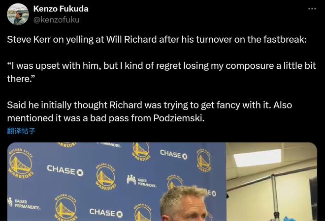 除此之外,科尔谈到了库里的伤病问题,透露库里在赛前进行了个人训练,自己认为他本赛季肯定会回归,但恢复时间不确定是一周、两周,还是更长的时间,因为他的状况有些棘手。