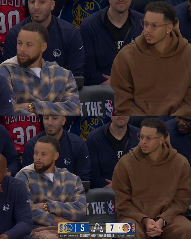 苦吞21分大逆转,残阵勇士虽败犹荣!1.93亿豪阵伤缺枯坐替补席,库里自嘲自己和克莱是“水花兄弟”与赛斯则是“康复兄弟”。