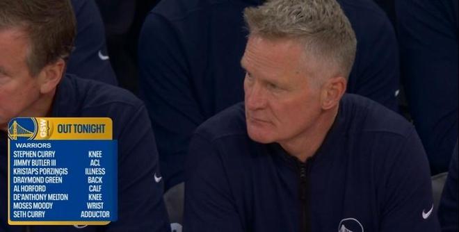 本场库里(膝伤)、巴特勒(报销)、波神(生病)、追梦(背伤)、霍福德(小腿伤)、梅尔顿(膝伤)、穆迪(手腕伤)、赛斯库里(内收肌伤)悉数缺席。
