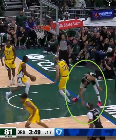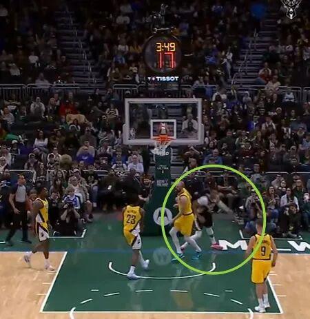 值得一提的是,字母哥因为意外受伤,一直就在前场没有参与退防,步行者进攻失误后,雄鹿一个长传正好给到了前场的字母哥。