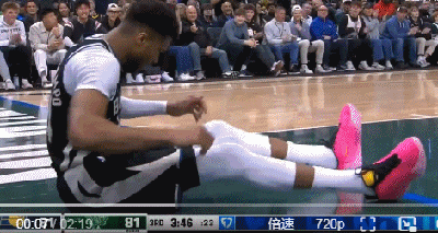 第三节,字母哥一个转身残暴扣篮后落地失衡,疑似崴脚受伤