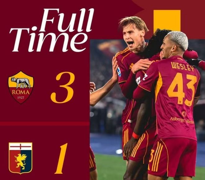 罗马是处于积分榜前四的球队,虽然上一场不敌尤文,但是本轮回到主场对阵热那亚还是展现了强大的实力,上半场就连入三球,提前杀死了比赛,马蒂亚斯-苏莱、科内、埃文-弗格森先后建功,第87分钟埃哈托尔帮助热那亚追回一球,最终罗马3-1全取三分,收获赛季第11场胜利,以33分继续力压32分的尤文暂列第4名。