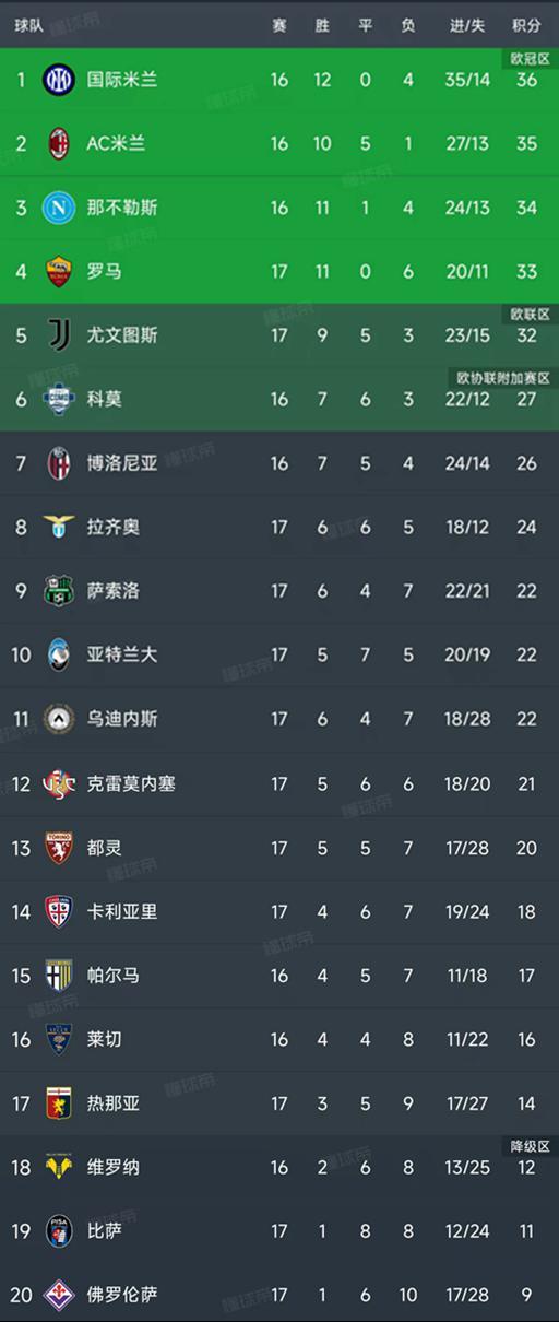 意甲第17轮结束了所有比赛,最新积分榜如下!