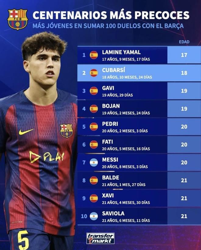 巴萨最年轻百场榜单出炉:亚马尔第1 梅西才第7?