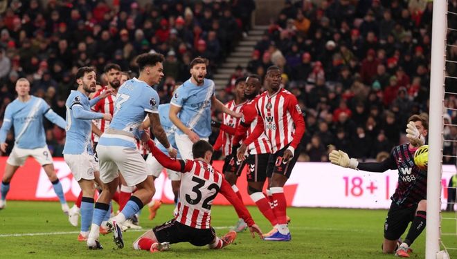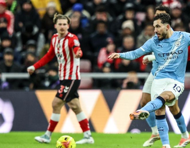 英超第19轮的一场比赛展开争夺,曼城做客挑战升班马桑德兰。上半场,伯纳多-席尔瓦进球被吹掉,布罗贝伊浪费单刀机会,休姆推射踢高,哈兰德错失良机。下半场,萨维尼奥屡失良机,多库射门被挡出,格瓦迪奥尔射门中柱。最终,曼城0-0桑德兰,各项赛事8连胜被终结。