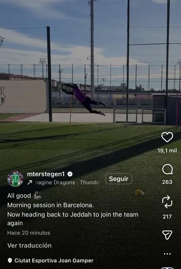 特尔施特根在社交媒体上确认,自己返回吉达参加巴萨的训练营,准备参加超级杯决赛,此前已确认,他的伤病无碍。