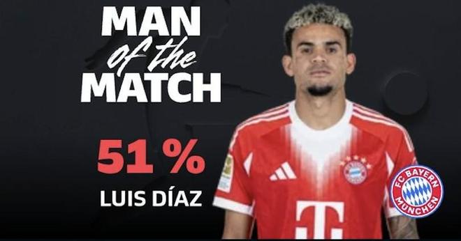 最终经过德甲官网球迷投票,路易斯-迪亚斯以51%的得票率当选本场比赛最佳球员。