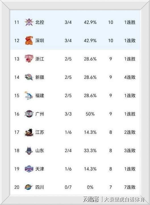 榜尾方面,7连败的四川男篮倒数第一,6负1胜的天津队和2胜4负的山东队倒数二三。