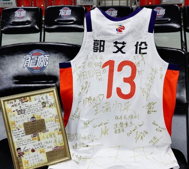 广州球员们集体为郭艾伦在球衣上签名,写上他们的祝福话语,希望郭艾伦能够早日康复王者归来。