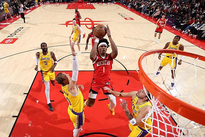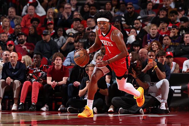 本场比赛中,火箭的先发控卫阿门-汤普森(Amen Thompson)的个人表现还是不错的,但是他在场上也并没有起到应该起到的作用,完全没有扮演好自己的角色。阿门全场出场40分32秒,投篮13中8,三分线外1中0,罚球4中3,得到了19分12篮板5助攻1盖帽的数据,其中还包括了5个前场篮板,还有4次失误和3次犯规,正负值为-6。阿门的进攻效率还是不错的,他还是能够在对手内线制造一些威胁的,他的篮下终结能力相当不错,他在前场篮板争抢方面的表现也是非常出色的。不过阿门在外线投篮方面的短板,在传球和组织能力方面的不足,在失误控制方面所出现的问题,也都是肉眼可见的。阿门在后场篮板保护方面也做得不错,在防守端也算是尽力了,但是他在场上的表现还是差了一些的。作为先发控卫,阿门在组织和串联方面的表现实在是不太理想,甚至可以说他根本没有去做什么跟控卫相关的事情。