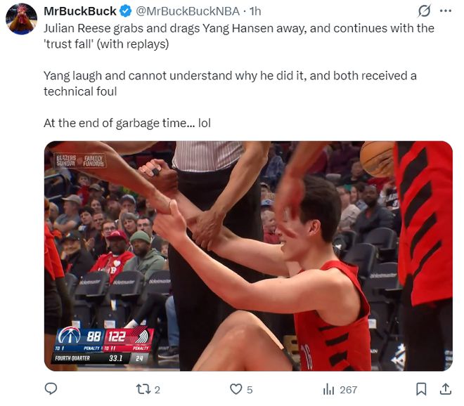 美媒也为杨瀚森抱不平:在比赛垃圾时间,朱利安-里斯从身后抓住杨瀚森将他拖走,然后进行了‘信任坠落’(抱摔),杨瀚森哈哈大笑不明白里斯为何这样做,裁判在看了回放的情况下给了两人技术犯规。