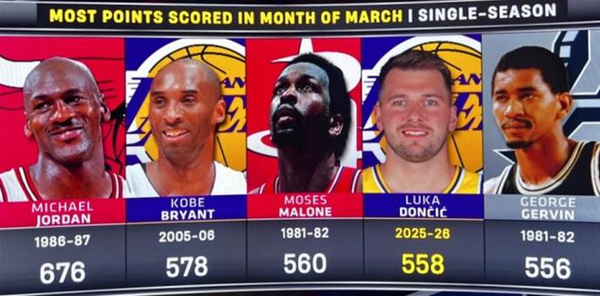 本场比赛结束后,3月份东契奇总得分定格在600分,成为NBA历史上第二位在三月份总得分达到600分大关的球员,比肩篮球之神乔丹,期间东契奇场均可以交出37.5分8板7.4助2.3断。
