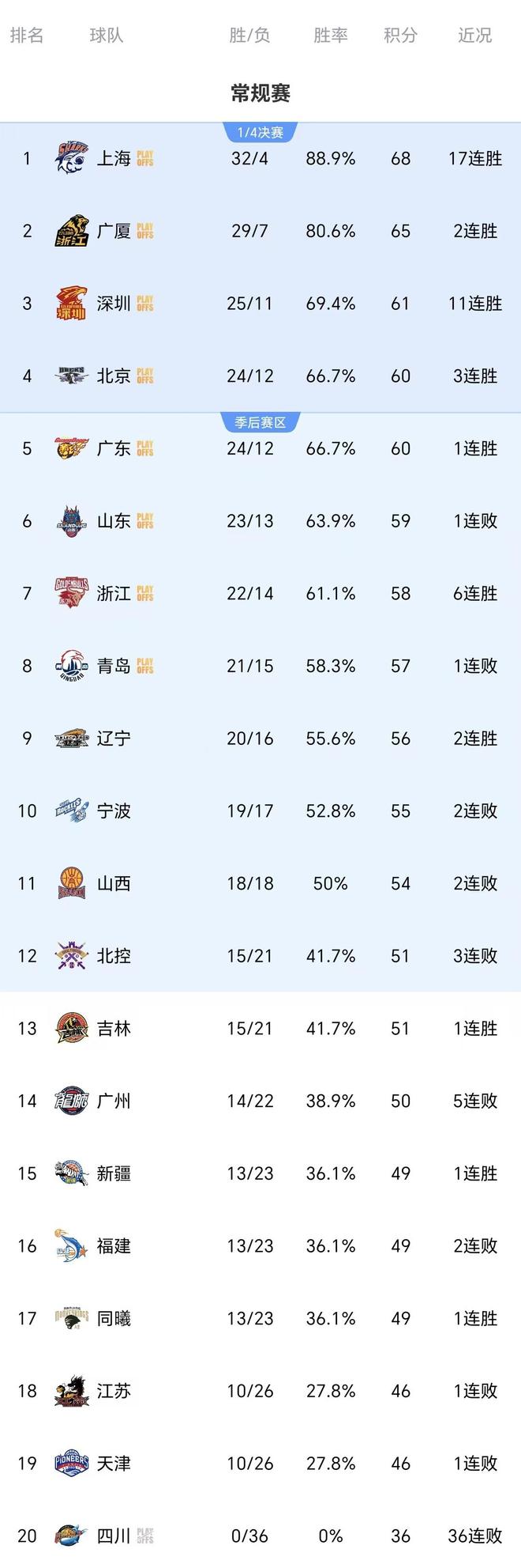 浙江队已经提前晋级季后赛,并且近期取得一波五连胜,江苏队距离季后赛区还差五个胜场,仅剩七轮情况下几乎不太可能晋级。