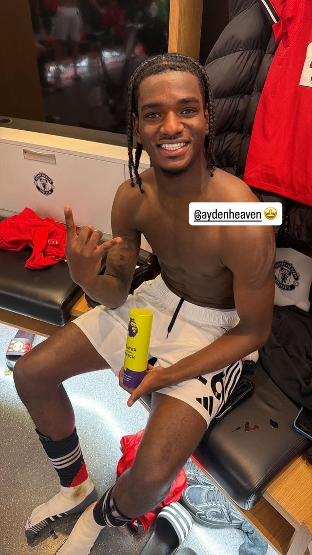 曼联后卫约罗赛后在社交媒体晒出了海文在更衣室的照片,海文对着镜头比出手势,另一只手则拿着全场最佳球员奖杯。