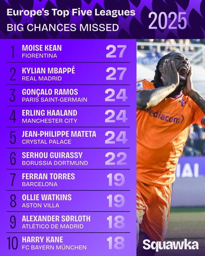 Squawka统计2025年五大联赛错失绝佳机会榜: